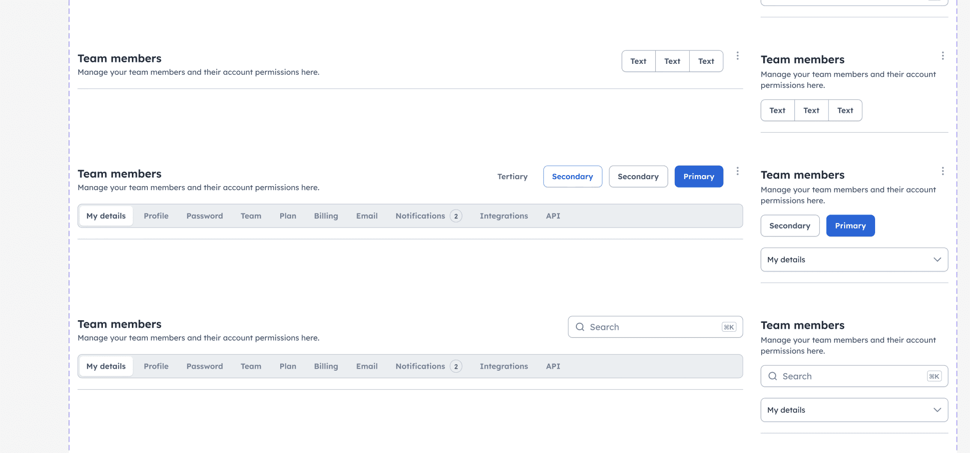 Structural variations (eg: side sheets vs bottom sheets) shared the same hierarchy, actions, and rules.